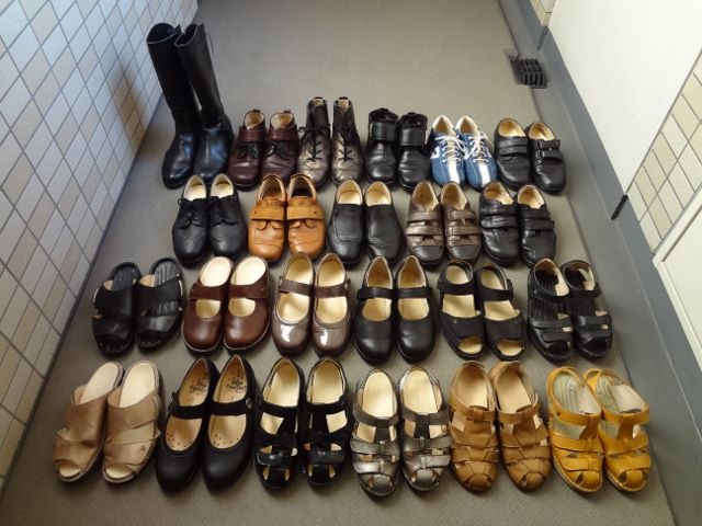 2015/03/05 Category : 衣 引退 以前も靴をお見せしましたが、早いものであれから2年が経ちました。以前18足だったものが、23足に増えています。下駄箱もいっぱいで、そろそろ使っていない靴を処分しなければなりません。そこでやむなく初代を見送ることにしました。左膝を人工関節にした10数年前のこと、膝がX脚になり、それを矯正するために靴底に傾斜をつけました。そして、人工関節にしてからその傾斜を取るなど、何度も改造を繰り返した靴です。私が一番大変な時期を共に乗り越えてきた靴だけに、なかなか処分に踏み切れなかったのですが、最近の高性能な靴と比べてしまうと、重くて大きくて履きにくい靴になってしまいました。そのようなことで、引退するにあたりみんなで記念写真を撮ってお別れです。アルカの靴の学校で、実習用に使ってくださるというので、ゴミとして捨てないですむだけでも、ありがたいです。初代、お世話になりました。野口