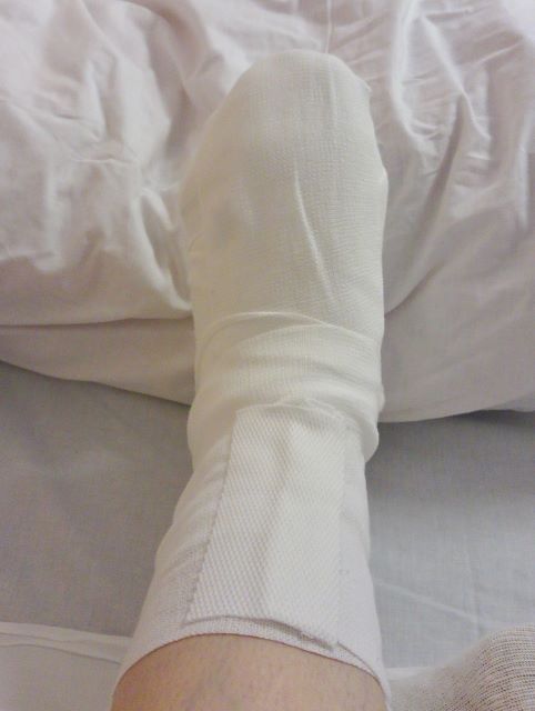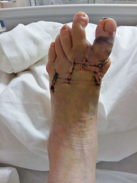 2015/08/31 Category : リウマチ 足の手術 久しぶりのブログの更新です。すっかりご無沙汰しています。このところ、役に立つ情報を提供できずに心苦しく思っておりますが、またまた、痛いご報告になってしまいました。8月20日に左足の骨切術(名前が恐ろしい。。。)を受け、先週末に退院してきました。正確な手術名は、「左足趾形成術(母趾、Ⅱ、Ⅲ、Ⅳ、Ⅴ中足骨短縮骨切術)」5本すべての骨切をして、ボルトで留めています。その結果、足が小さくなり、レントゲンを見ると指が宙に浮いています。術後1週間、かかとで歩いて良いと言われていますが、内部のダメージが大きいのか、足の裏が腫れてまだ歩けない状態です。膝の人工関節置換術よりも術後の痛みが辛かったのと、歩けるようになるまでに時間がかかっています。今後、手術をお考えのリウマチ患者さんの参考のため、before-afterの写真をお見せしますが、そういうものが苦手な方はafterは見ないでくださいね。before(手術の前日) after(手術後2日目) 野口