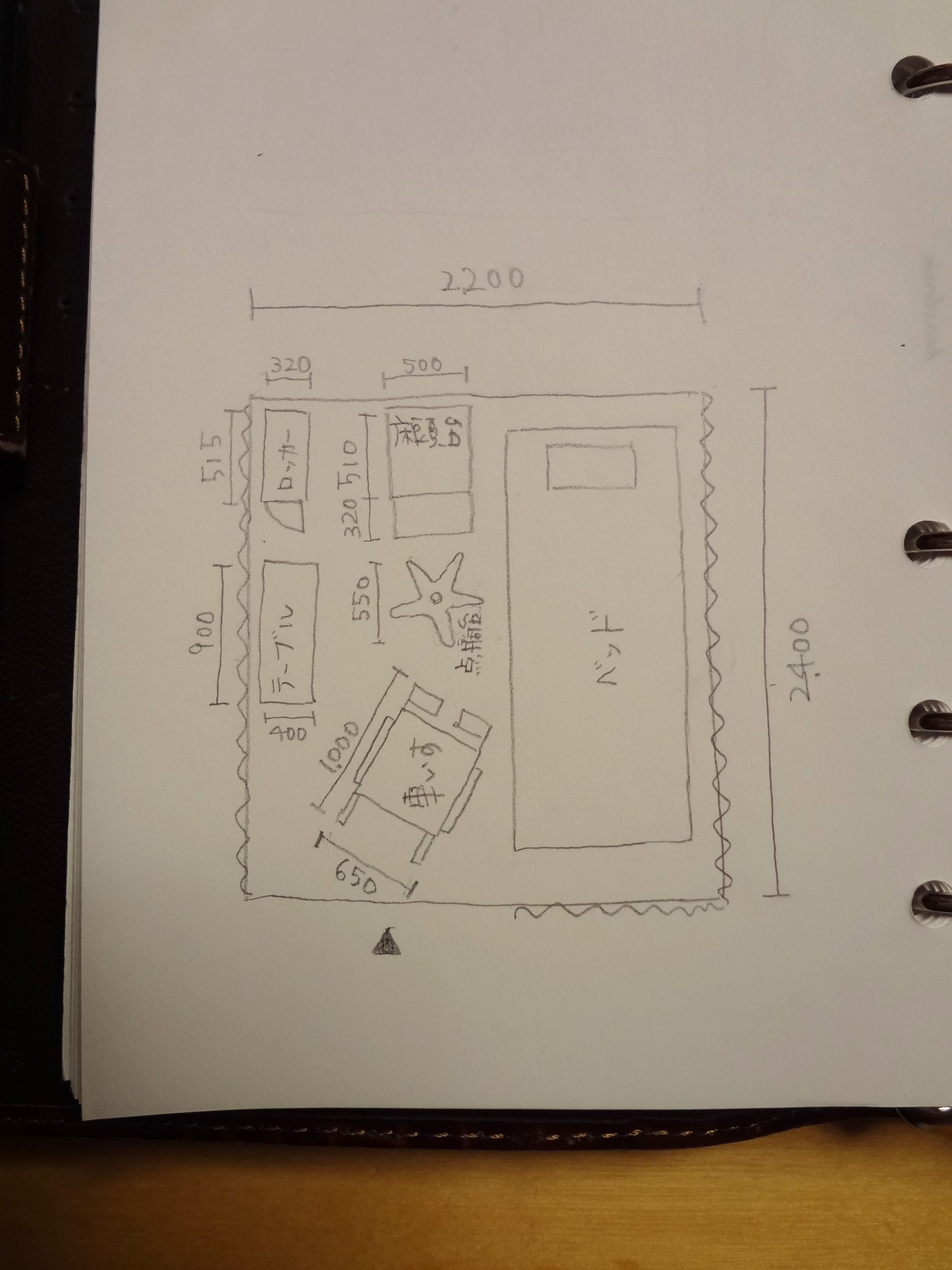 2015/10/05 Category : 住 病室のストレス 先日の手術では某大学病院の整形外科病棟に入院、7人部屋のカーテンで仕切られた2.2m×2.4mの空間に軟禁状態でしたので、退屈しのぎに空間の寸法を測ってスケッチしました。寸法は正確ですが、スケッチがアバウトですみません。医療法施行規則によると、2人以上の病室の1人あたりの床面積(内法)は4.3㎡以上とあるので、それよりは広いことになりますが、ベッド、床頭台、ロッカー、テーブル、車いす、点滴棒、ゴミ箱と色々なものが詰め込まれて、点滴、食事、車いすへの移乗のたびに、ものを動かさなければなりませんでした。さらに、本来は、家族・見舞い客用イスが置けないといけません。この場合、家族は車いすに座るしかなかったわけです。そうした広さの問題もありますが、カーテンで仕切られたこの空間以外、病院内で過ごす場所と言えば、同じ階のトイレ、洗面所、デイルームくらい。入院生活には慣れっこの私でも、居場所がないそのストレスは大きく、日が経つにつれて元気がなくなってきます。闘病そのものが辛いのはやむを得ませんが、空間のストレスが追い打ちをかけることがないように、心地よい空間とはどんなものか追求したいものです。野口