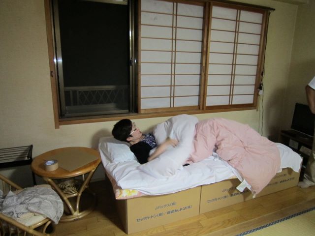 2013/03/11 Category : 住 避難生活の必需品:段ボールベッド リウマチさんが避難所生活を送る際に、ベッドと洋式便器+洗浄便座は欠かすことができません。膝や股関節の可動域に制限があるため、床に敷かれた布団に寝ようとするなら、マッチ棒を倒すように、パタンと倒れるしかないのです。くどいようですが、畳の上に座る動作ができませんので、例えば、知人宅を訪問して和室に通されたら、ずっと立っているしかないのです。東日本大震災の被災地に支援や調査に入りたくても、4ヶ月後の7月まで入れなかったのはそれが大きな理由です。9月、日本福祉のまちづくり学会のメンバーと一緒に岩手県沿岸部を訪れた際は、津波の被害にあった釜石の宝来館の4階に泊めていただきました。そこで、ベッドがないと寝られない私のために、東北支部長の狩野さんが避難所で評判だったという段ボールベッドを運んできてくださって、髙橋会長をはじめ、学会のメンバーで組み立ててくれました。リウマチ関係の学会では避難所にはベッドが必要だとの報告がされていますが、多くの方には知られていないので、知っていただければと、私のお見苦しい写真も掲載します。この段ボールベッドは大船渡市の避難所で配布されたとのことです。今でも仮設住宅に持ち込んで利用されている方もおられます。学会のメンバーで組み立ててくれているところ段ボールベッド完成野口