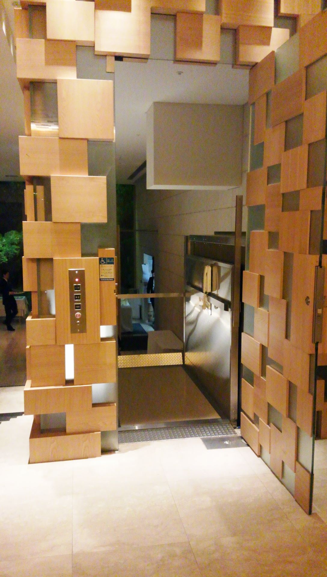 2013/04/07 Category : まち デザインされた昇降機 4月はじめ、三重県に住む友人が上京。桜のお花見も期待して早々と椿山荘のレストランを予約しましたが、開花時期は大外れ。当日は大雨で、庭園散策もできませんでした。レストランは階段を下りていくようになっていますが、その横に昇降機が後付けされていました。扉を閉めると、デザインされた壁で、昇降機の存在に気がつきません。それを利用した友人を昇降機の前でパチリ。後で気がついたら、記念写真はそれだけしか撮っていませんでした。もっと美しい撮影ポイントがいっぱいあったというのに。職業病というか、マニアックな写真でごめんなさい。